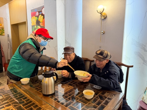 活动当天,志愿者们兵分两路,一队为敬老中心食堂分餐;另一队去陪伴行动不便的独居老人。经过简短的岗位分工与服务培训,志愿者们迅速投入助餐服务,餐厅里,志愿者们耐心协助高龄老人就座,根据老人口味调整饭菜分量,还为牙口不好的老人把米饭压得更软,一句句 “爷爷慢慢吃”“奶奶不够再添” 让餐厅暖意融融。用餐结束后,志愿者们主动收拾餐桌、清洗餐具,细致擦拭桌椅与地面,甚至贴心整理好老人随手放在一旁的衣物,直至完成签退仍不忘叮嘱老人们注意保暖。浙江雨花老年公益事业发展中心杨乐乐感慨道:“感谢信立传媒的志愿者们贴心又专业的陪伴,老人们今天笑得特别开心,这份关怀让他们切实感受到了党组织与社会大家庭的温暖。”