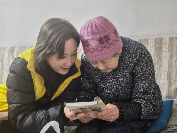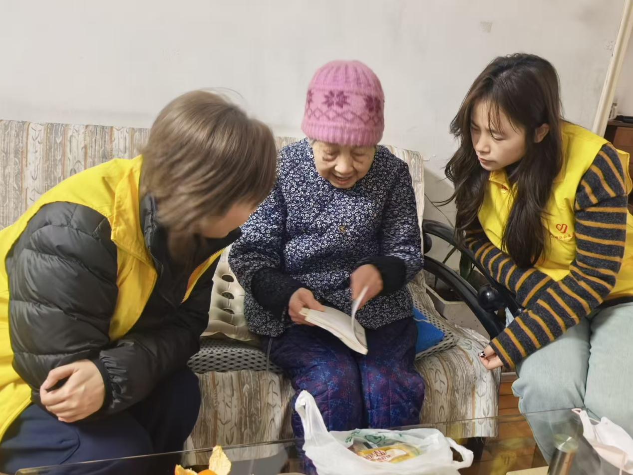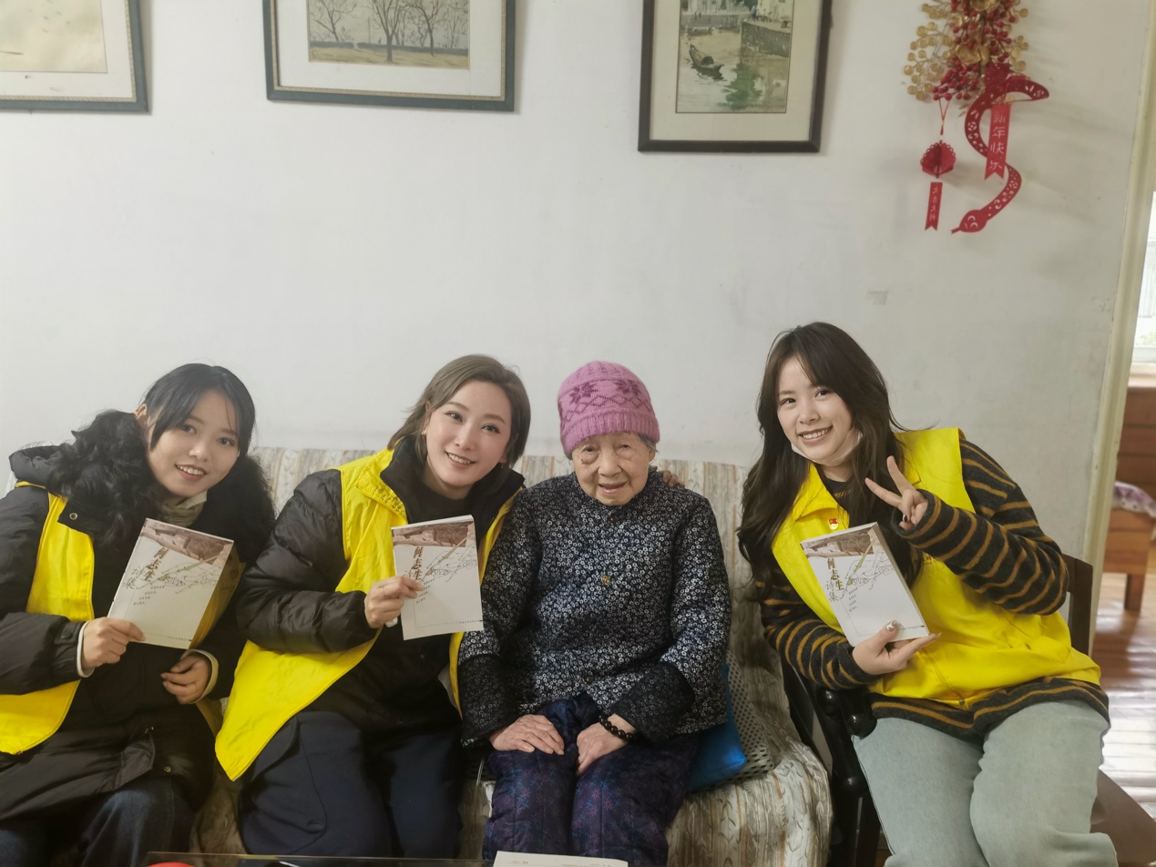 钟旖珺、张雅静、贺晗三位党员,跟随雨花的工作人员一同前往探访了年逾九旬、独居已久的沈奶奶,将融融暖意与贴心关怀实实在在地送到了老人的家中。党员们手提精心挑选的阿克苏苹果,还特意准备了软糯适口、易于消化的粥食,一进门便让老人感受到了满满的温情。刚一落座,他们便围坐在老人身旁,亲切地陪老人拉起家常,耐心倾听老人娓娓道来那些过往岁月里的生活故事。沈奶奶见此情景,亦是满心欢喜,脸上绽放出如阳光般灿烂的笑容,她热情地捧出与老伴共同编著的诗集,一本本亲手递到众人手中,还郑重其事地提笔为每个人题字留念,场面温馨而感人。