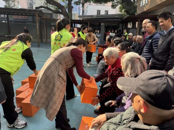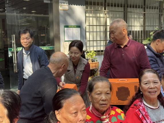 本次慰问活动以“党建聚力办实事 振兴好物暖桑榆”为主题,慰问的物资为支部此前参与“福兴高照·一定橙”活动采购的江西赣州兴国县优质助农产品——脐橙。在老年人日间照料中心,党员与工作人员分工协作、有条不紊,将每箱脐橙逐一分发到老人手中。金黄的果实既承载着革命老区的质朴烟火气,又饱含着党支部的真挚温情,让活动现场暖意融融。