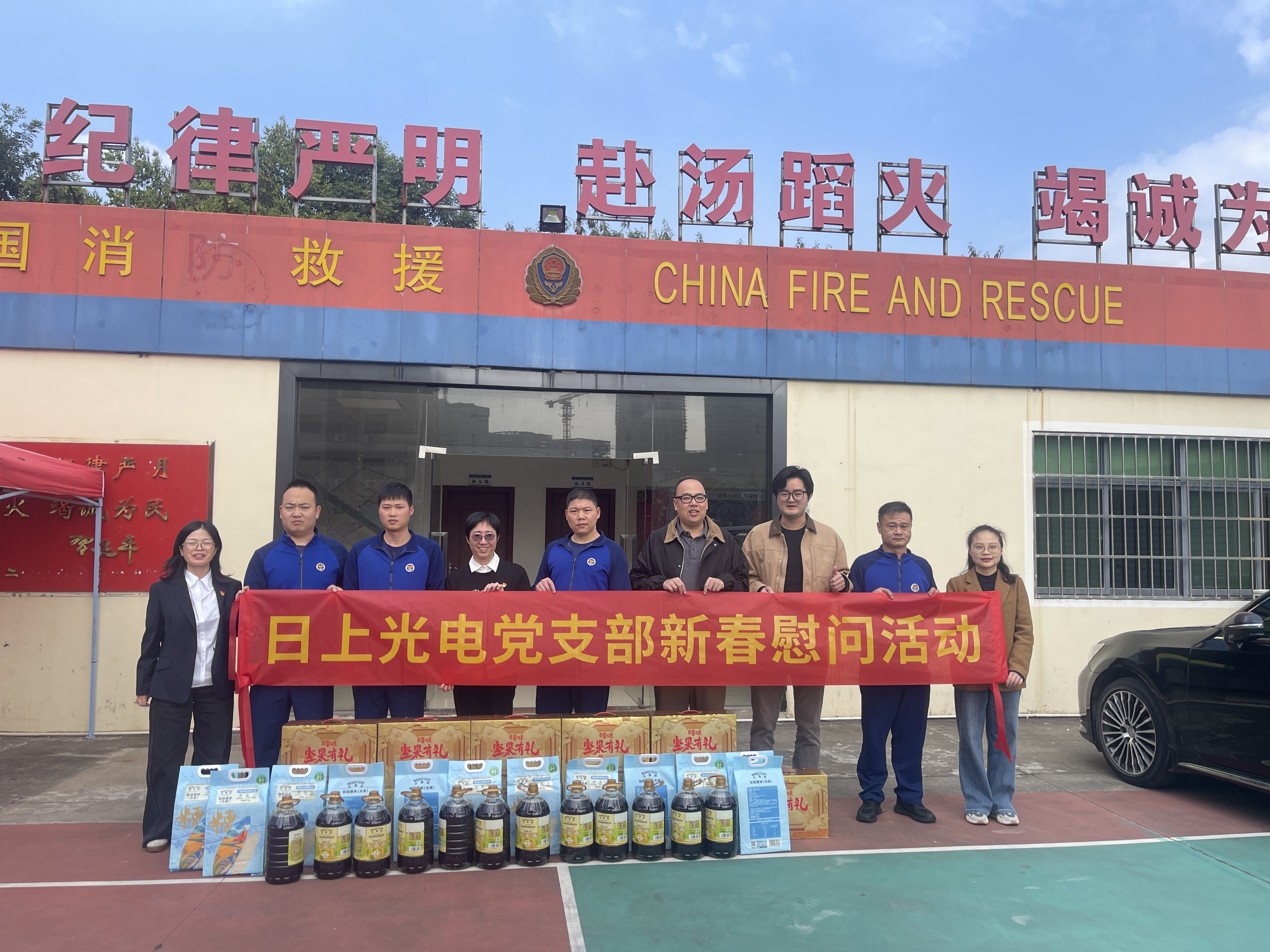 在2026年新春佳节即将来临之际,日上光电党支部代表与社区科技委员、社区工作人员一道,赴辖区消防救援站,开展“迎新春·送温暖”走访慰问活动,向奋战在防火灭火和应急救援一线的消防指战员致以节日的诚挚问候和崇高敬意,并送上慰问物资,表达各方的深切感谢与共同的社会责任担当。